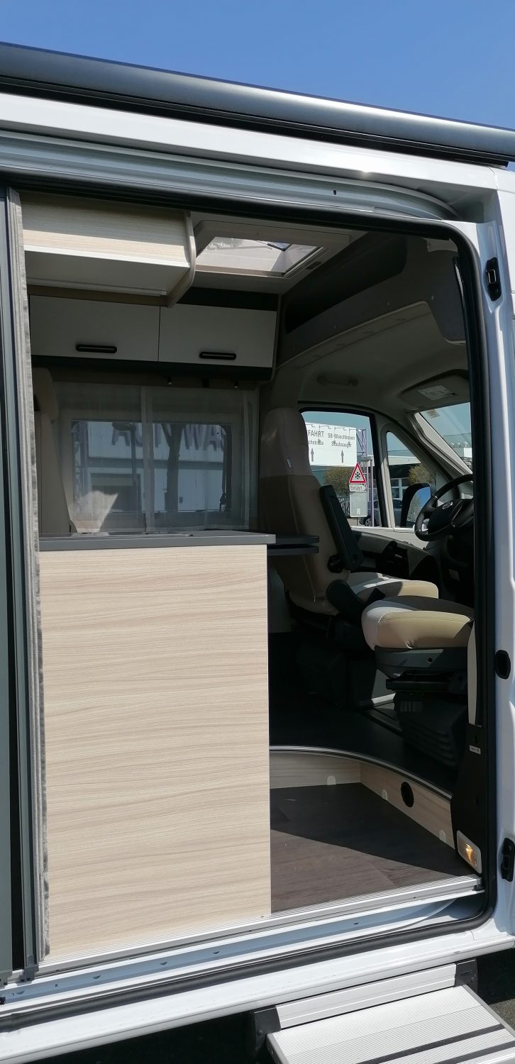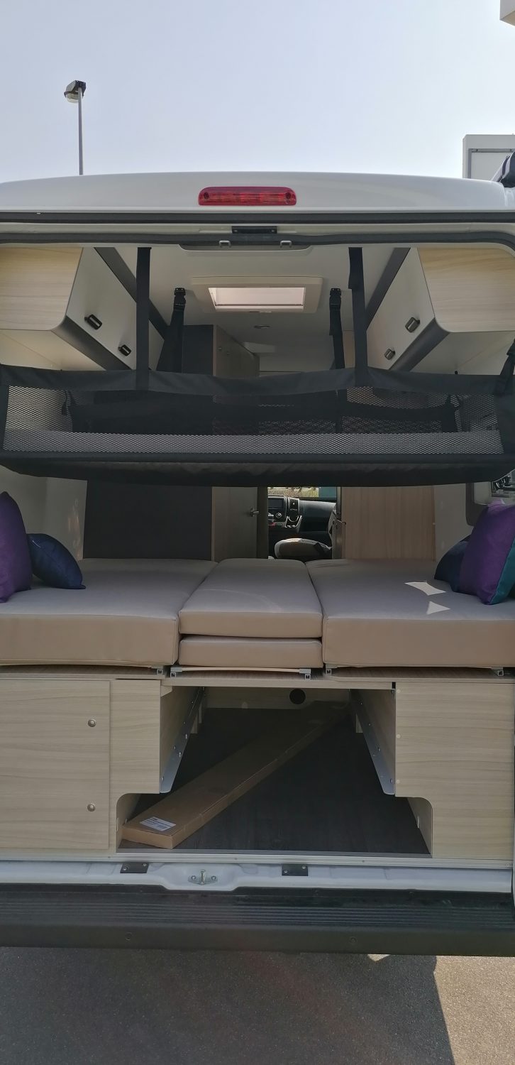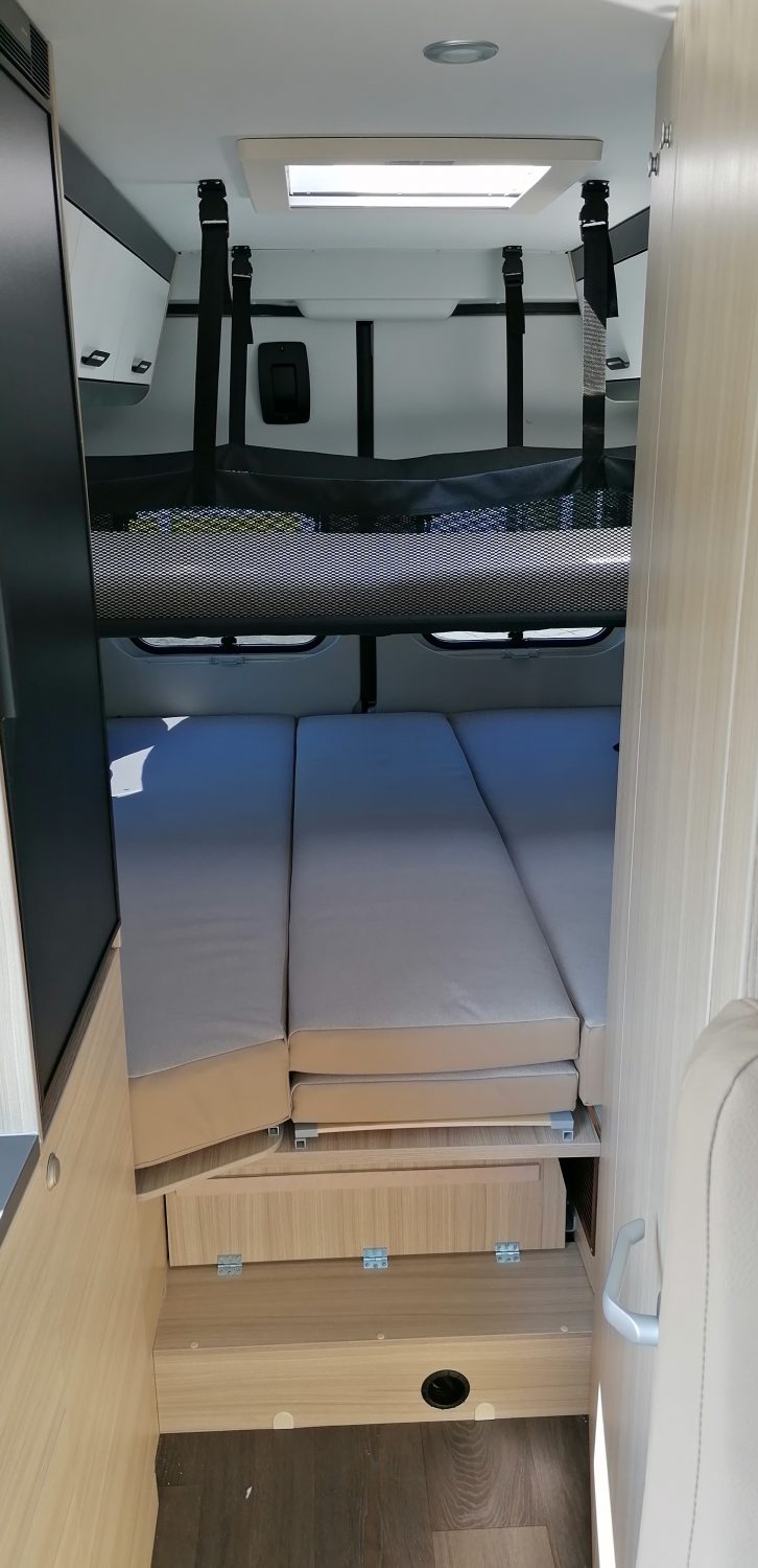 Das knapp 6,4 Meter lange Wohnmobil verfügt über zwei Längsbetten, die tagsüber zum Sofa umgebaut werden können. Mit einem Mittelteil können die Längsbetten zu einem Doppelbett oder als zusätzliche Schlafmöglichkeit für Kinder ergänzt werden. Als weitere Schlafmöglichkeit kann ein Einhängebett über den Längsbetten montiert und genutzt werden. Somit bietet das Reisemobil platzt für vier Personen.